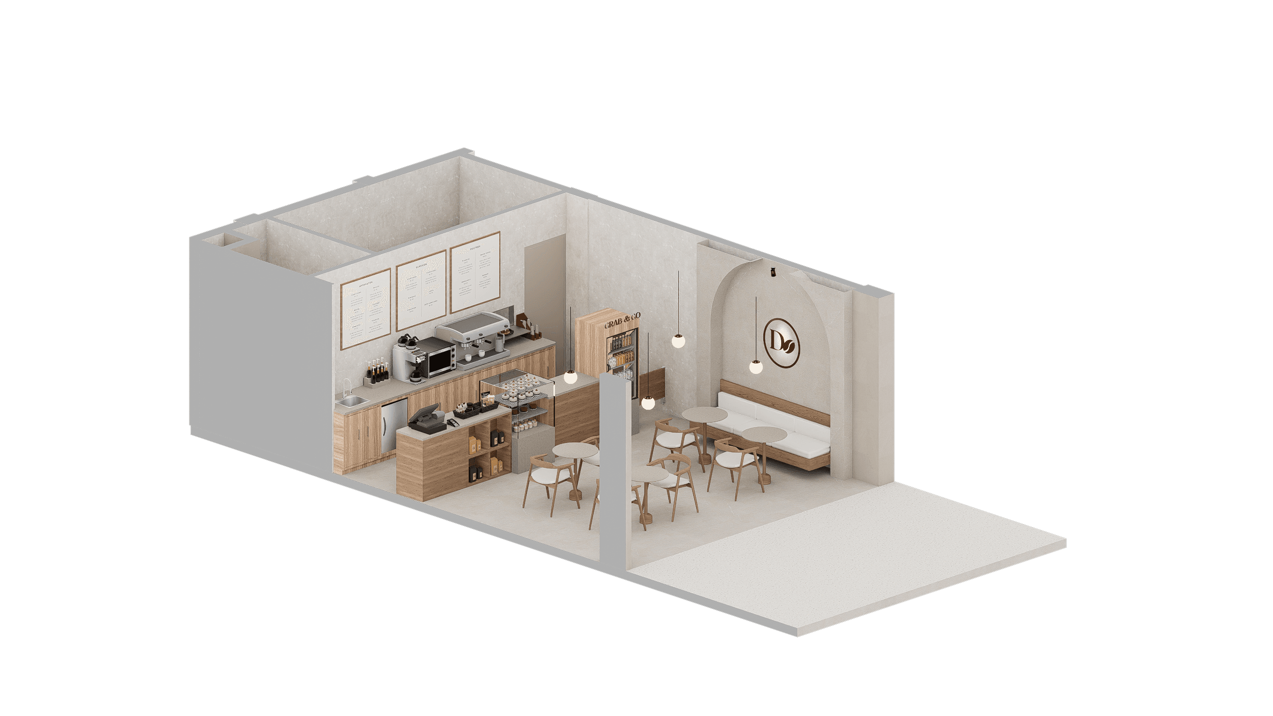 Dada la naturaleza del concepto coffee to go, se prioriza una distribución eficiente y ergonómica, que permitiera optimizar tiempos, movimientos y conexión entre el área de preparación y el punto de atención al cliente.