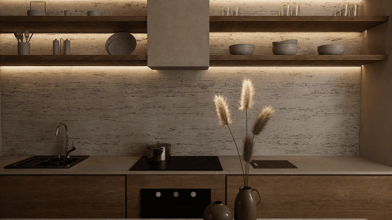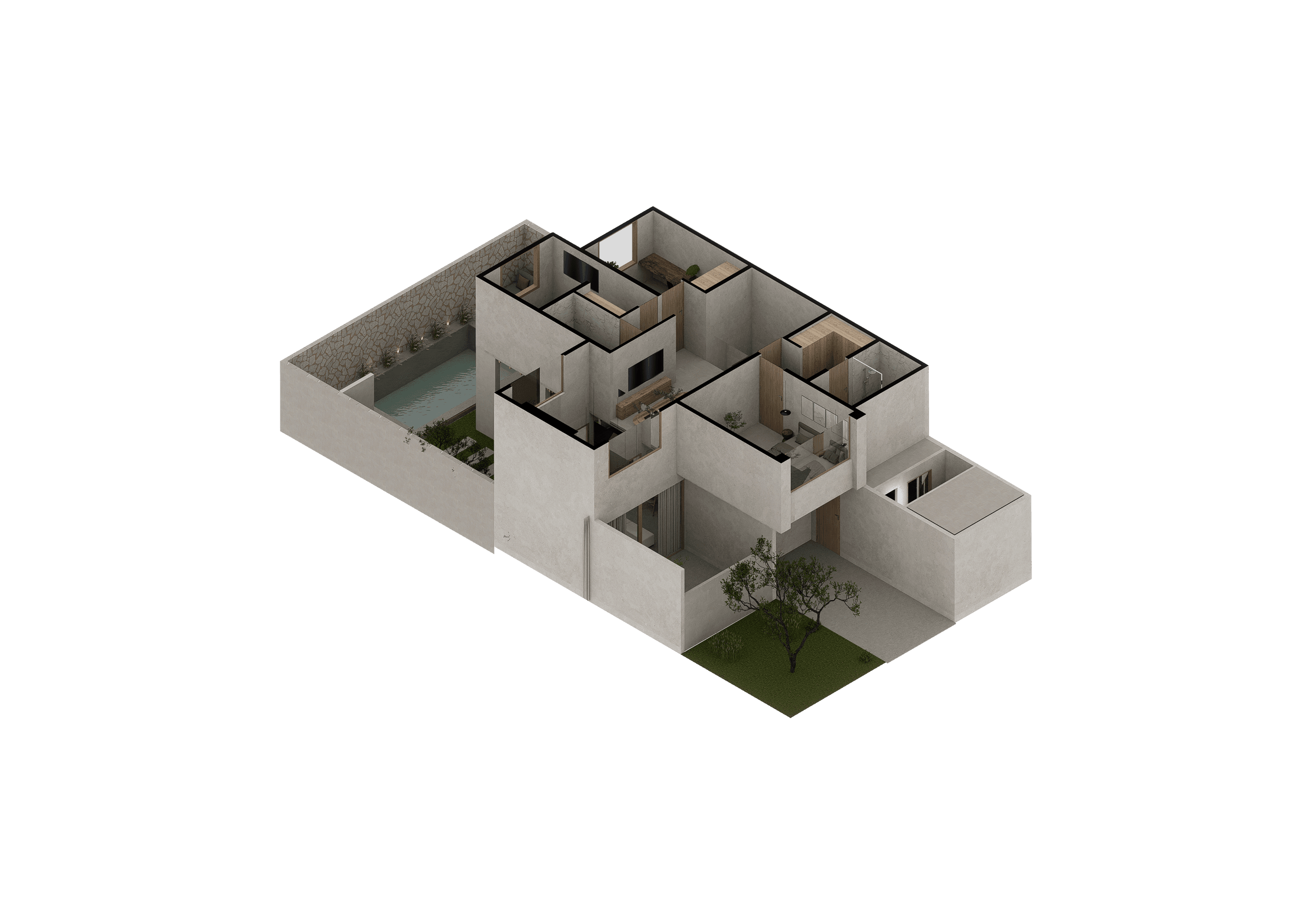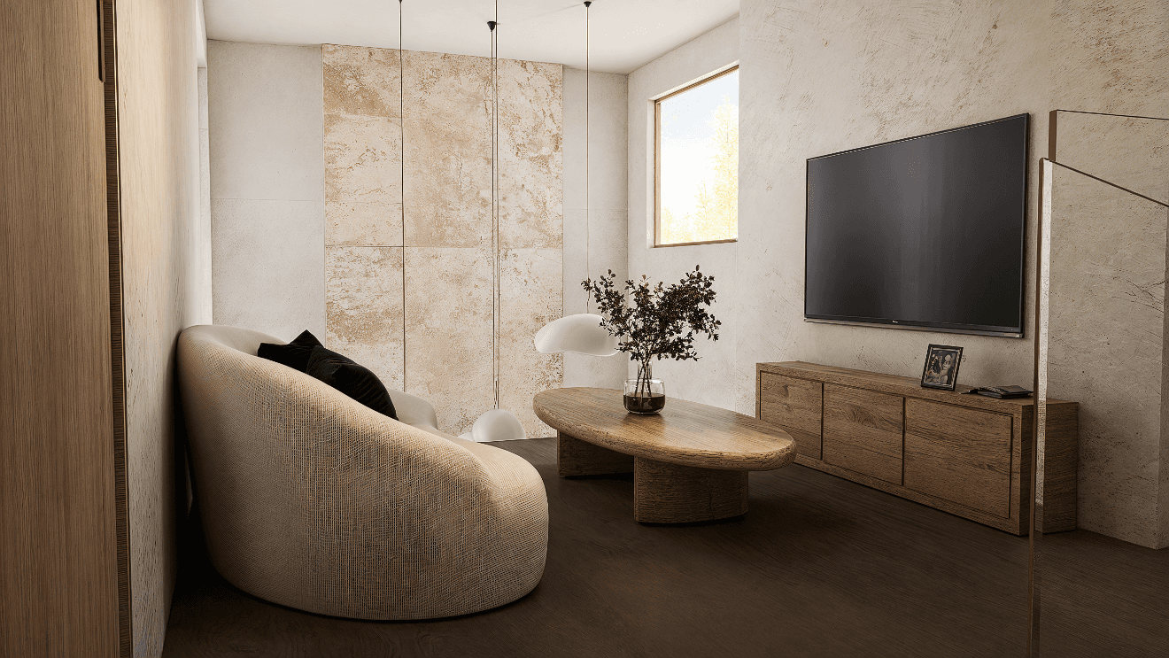 El concepto se fundamenta en la honestidad de los materiales. Estuco, concreto crudo y madera se presentan sin artificios, permitiendo que sus texturas, marcas y tonalidades hablen por sí mismas. Esta aproximación genera una atmósfera cálida, minimalista y profundamente humana, donde cada acabado expresa su origen y evoluciona con el tiempo.
