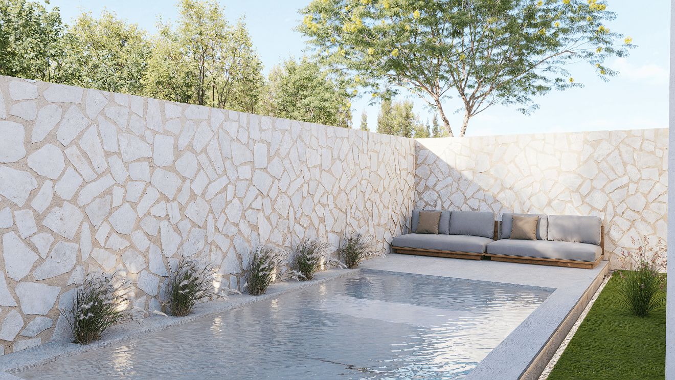 Nivel 1 – Área social y de servicio: un espacio abierto que integra sala, comedor y cocina, acompañado de una piscina y terraza exterior que fortalecen la conexión con el entorno natural.
